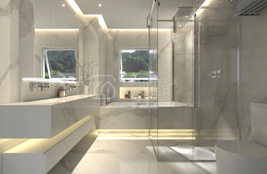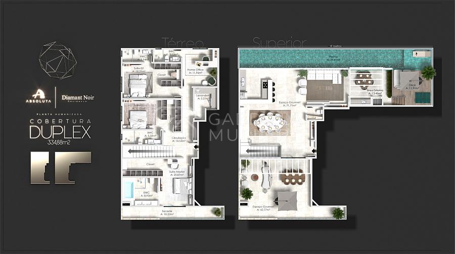 • Duplex 01 | 334.88m² | 03 Suítes, uma Master c/Sacada e Banheira + Banheiro Social + Home Oficce + Piscina Olimpíca c/Deck + Área Gormet + Terraço