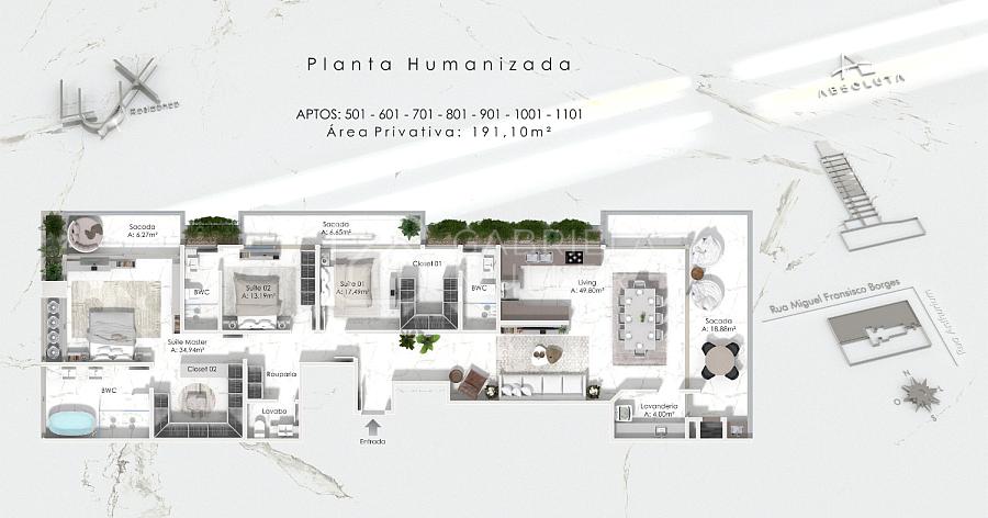 • 501 ao 1101 | 191.10m² | 03 Suítes c/Sacada, uma Master c/Banheira + Sacada c/Churrasqueira + Living + Lavabo + Lavanderia