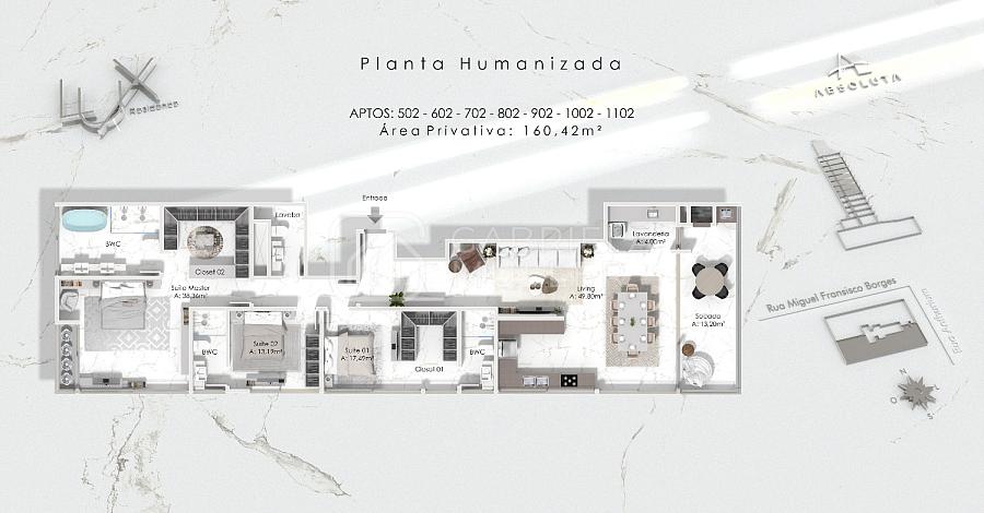 • 502 ao 1102 | 160.42m² | 03 Suítes c/Sacada, uma Master c/Banheira + Sacada c/Churrasqueira + Living + Lavabo + Lavanderia