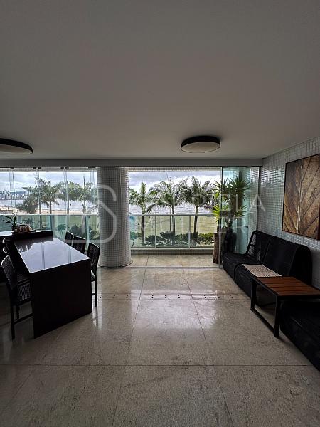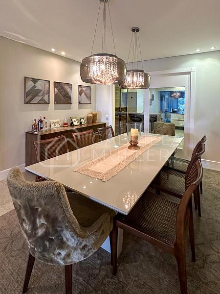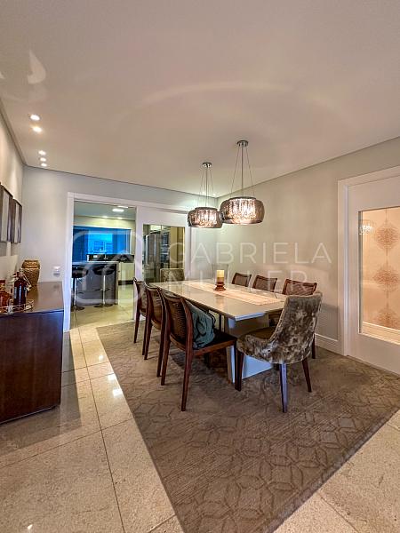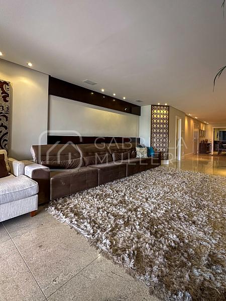 O apartamento possui 297m² e oferece um espaço generoso e bem distribuído, com 4 suítes, cozinha equipada, áreas de convivência amplas e diversas comodidades, como vagas de garagem, depósito e dependência de funcionária. Além disso, o condomínio conta com uma infraestrutura completa para lazer e bem-estar, incluindo piscinas, saunas, salas de massagem, academia e muito mais