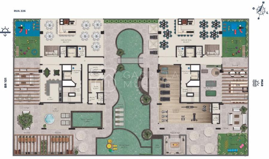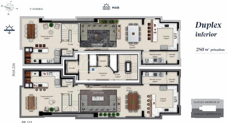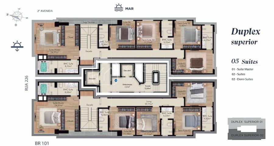 • COBERTURA DUPLEX TIPO 02 | 280.00m² | 05 Suítes, 1 Master c/Closet e Hidro, 02 Demi-Suítes + Espaço Gormet c/Churrasqueira + Sala de Estar Intíma + Living + Lavabo + Área de Serviço